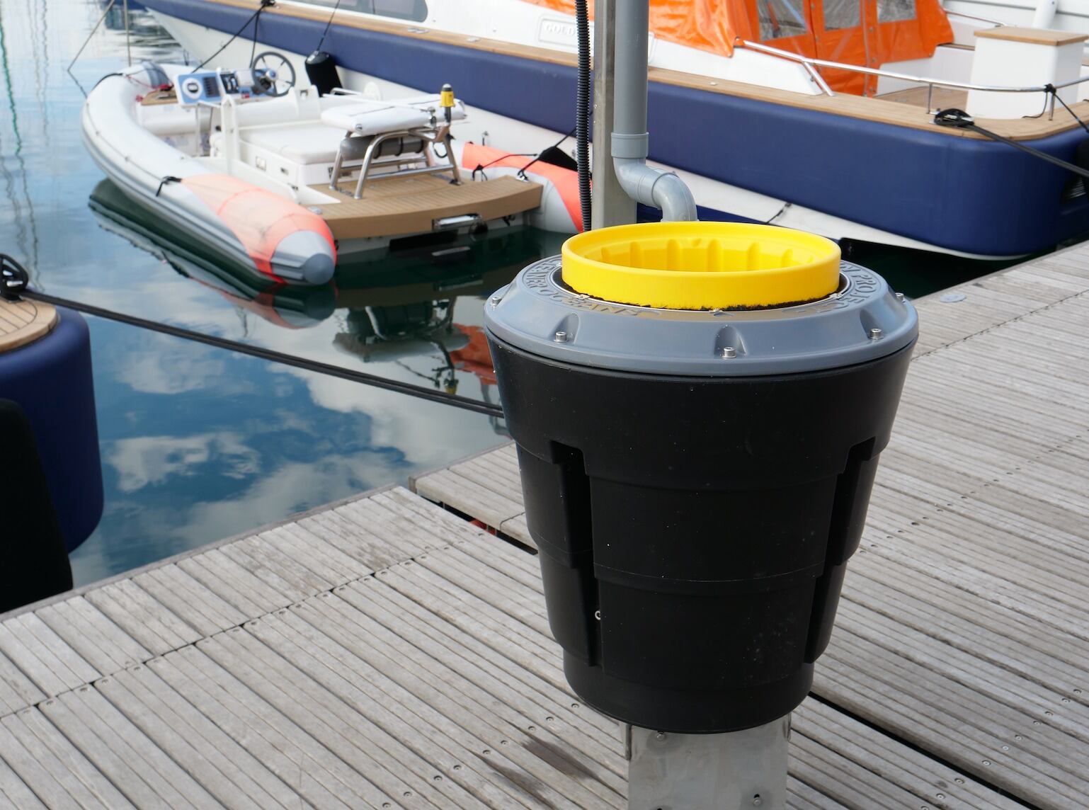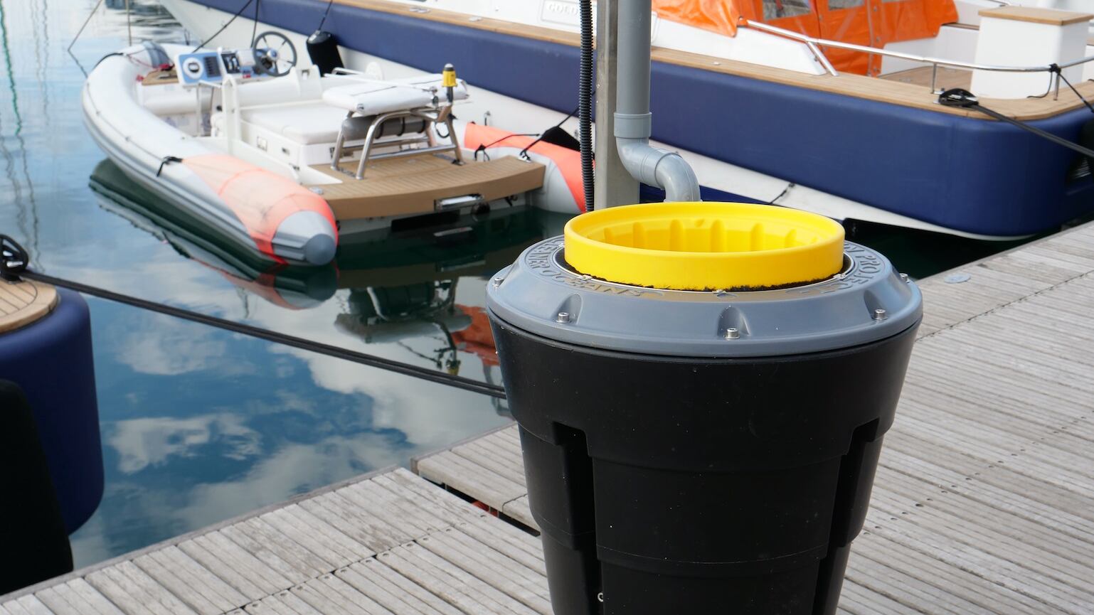 El Seabin es un contenedor de basura automatizado que recoge basura flotante, aceite, combustible y detergentes, que utiliza las corrientes naturales del agua para atraer la basura hacia él. La basura se recoge en una bolsa de fibra natural.