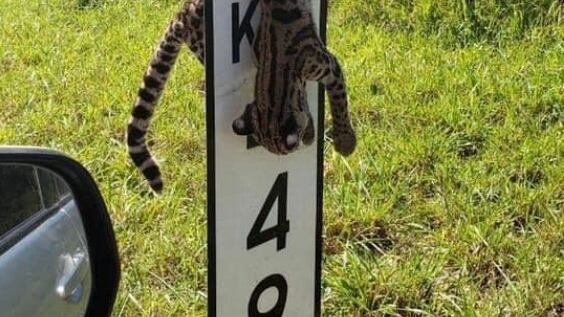 El cadáver de un pequeño felino fue localizado colgado sobre una señal de tránsito.
