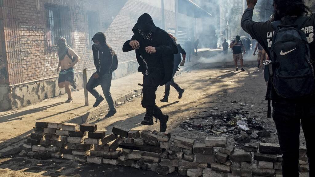 Pero alrededor de la protesta, centenares de encapuchados se enfrentaron a la Policía, en un hecho que se repitió en ciudades como Valparaíso (centro) y Concepción (sur) dejando 63 heridos entre civiles y uniformados.