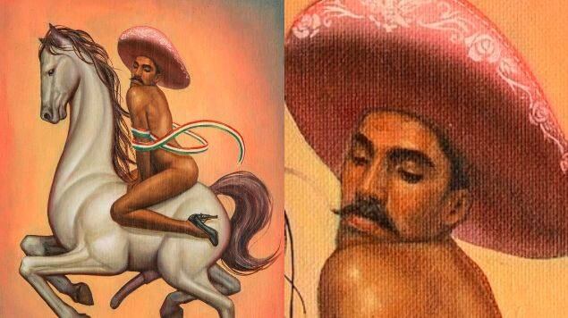 El cuadro es del artista Fabián Cháirez. La pieza ha causado gran controversia debido a la representación que se le da a este personaje de la Revolución Mexicana. Emiliano Zapata aparece sobre un caballo, desnudo y con tacones.
