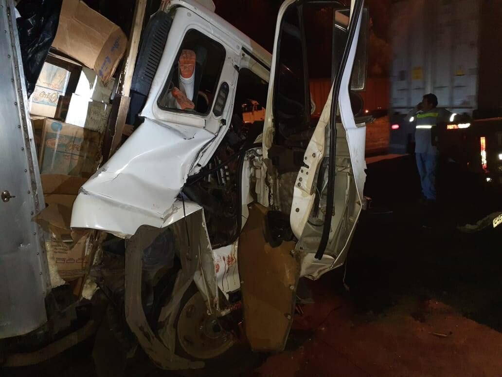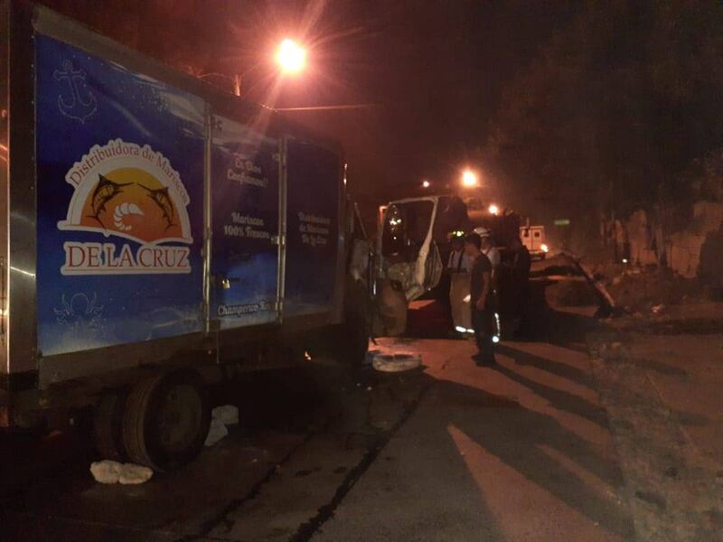 Por causas aún no establecidas, el piloto de este vehículo de carga, que en ese momento transportaba mariscos, perdió el control e impactó en la parte trasera de una plataforma que se encontraba estacionada a la orilla de la carretera.