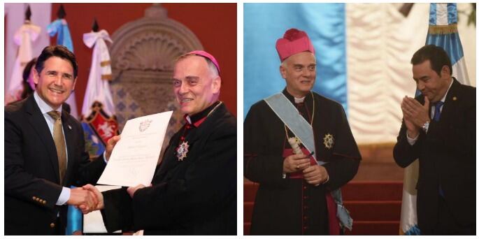 El presidente Jimmy Morales entregó este jueves un reconocimiento al nuncio apostólico, Nicolas Thevenin, por la labor realizada en Guatemala.