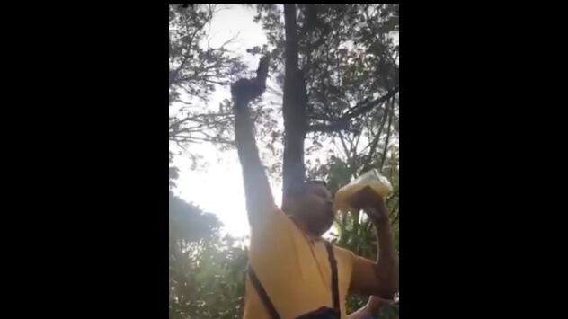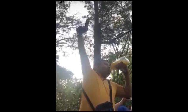 El protagonista de esta inaudito hecho es un hombre que al parecer está compartiendo con sus amigos. Se encuentran en un área abierta en la que se observan muchos árboles.