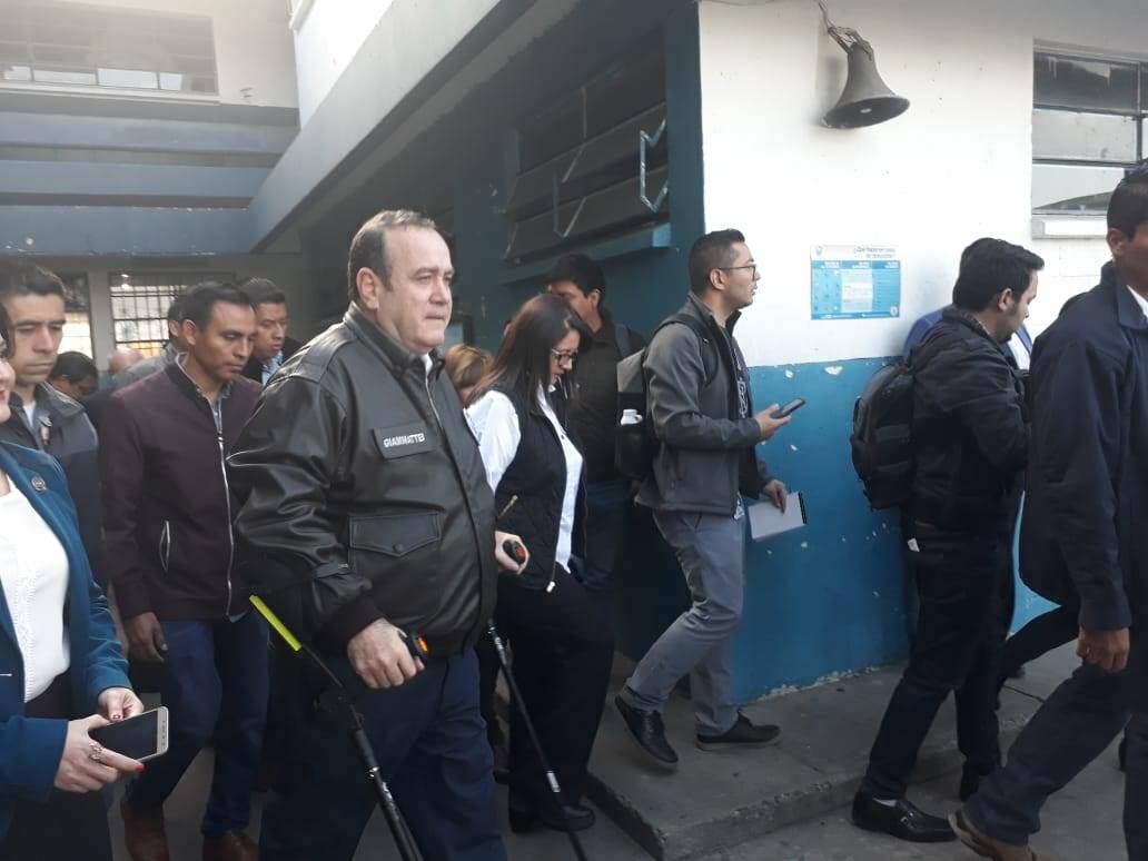 Giammattei estuvo acompañado de Carlos Sandoval, portavoz de gobierno, y su comitiva presidencial a la escuela.