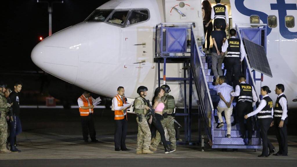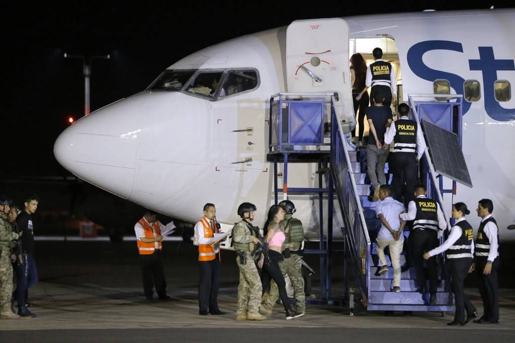 Los deportados, esposados, subieron a dos aviones comerciales fletados que despegaron rumbo a Caracas hacia las 00:30 (hora local) desde el área militar del Aeropuerto Internacional Jorge Chávez.