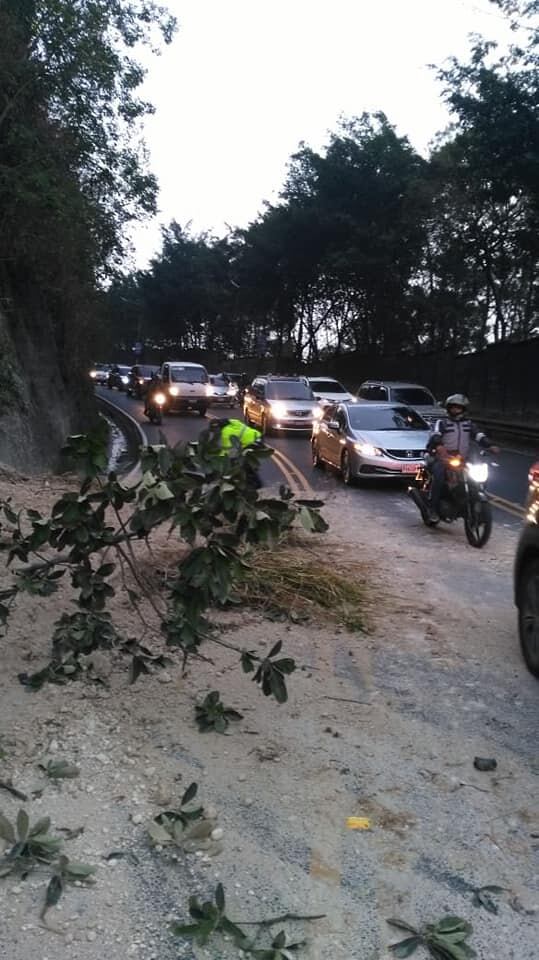 El derrumbe sucedió en el comienzo de la cuesta y se reportó que afectó a un motorista. Al parecer, el motorista derrapó debido a la arena y cayó en la vía.