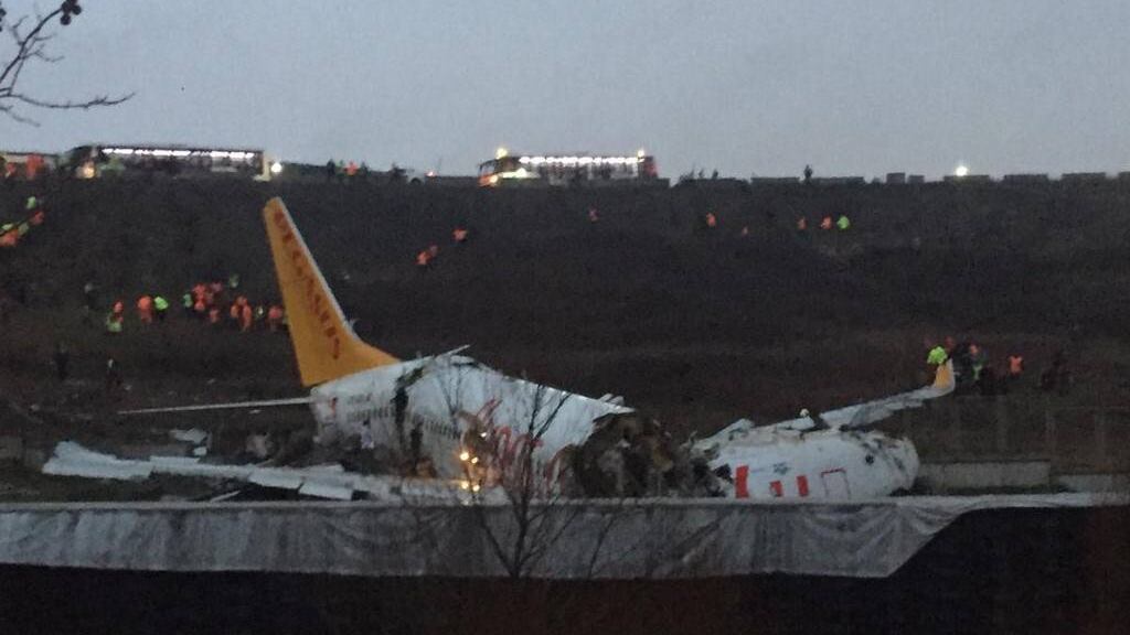 Un avión de pasajeros de la compañía Pegasus Airlines sufrió este miércoles un aparatoso accidente en el aeropuerto de Estambul, en Turquía, tras salirse de la pista de aterrizaje y partirse en tres.