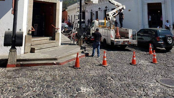 Esta mañana por las calles empedradas de la Antigua Guatemala se pudo observar una grúa para postes y varios empleados municipales trabajando en algunas esquinas.