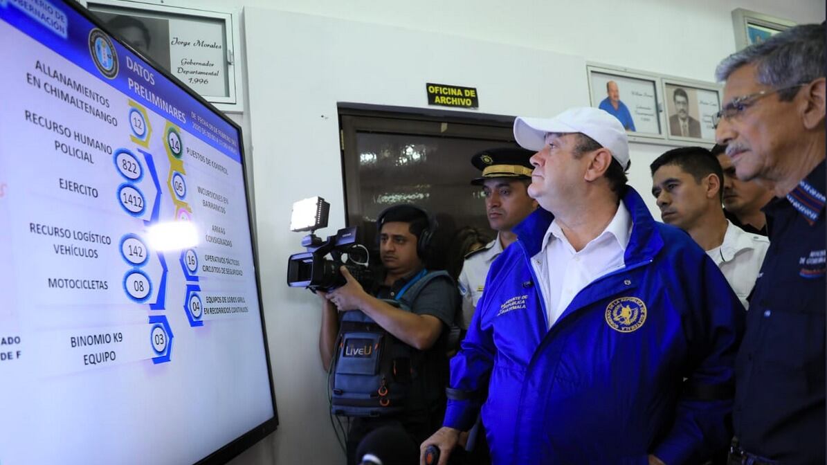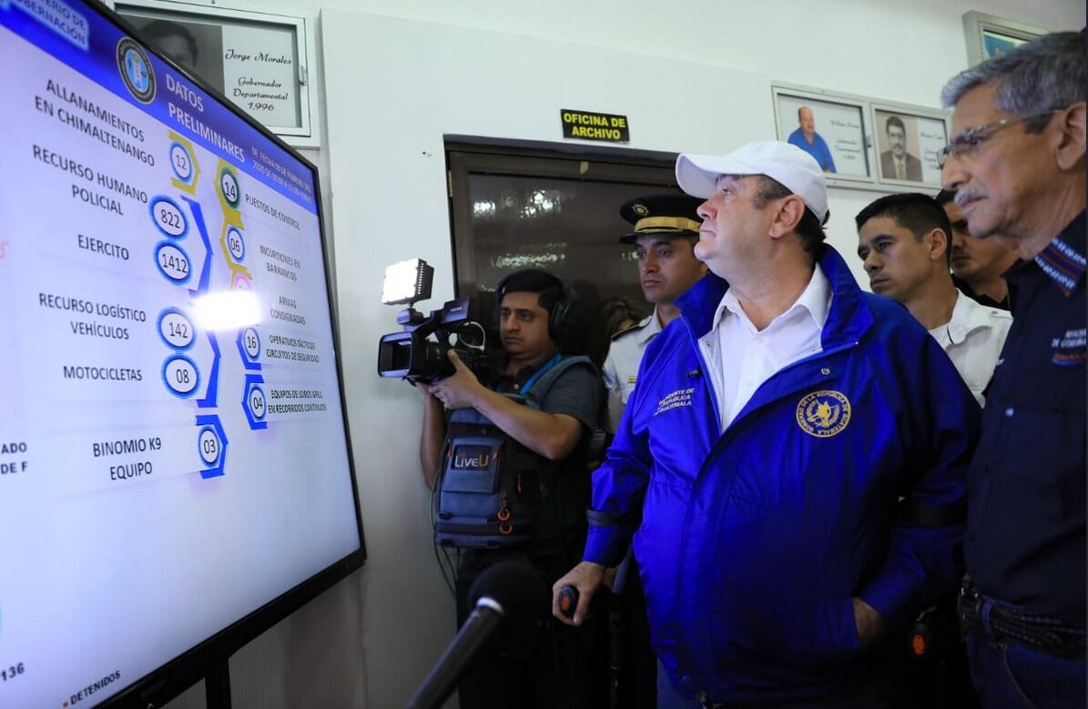 Acompañado de los ministros de Gobernación y de la Defensa, el mandatario, Alejandro Giammattei, visitó el centro de monitoreo de la Policía Nacional Civil (PNC) en Chimaltenango a cinco días de vigencia del estado de Prevención en tres municipios de ese departamento, donde recomendó a las personas a denunciar a los extorsionistas y pandilleros.