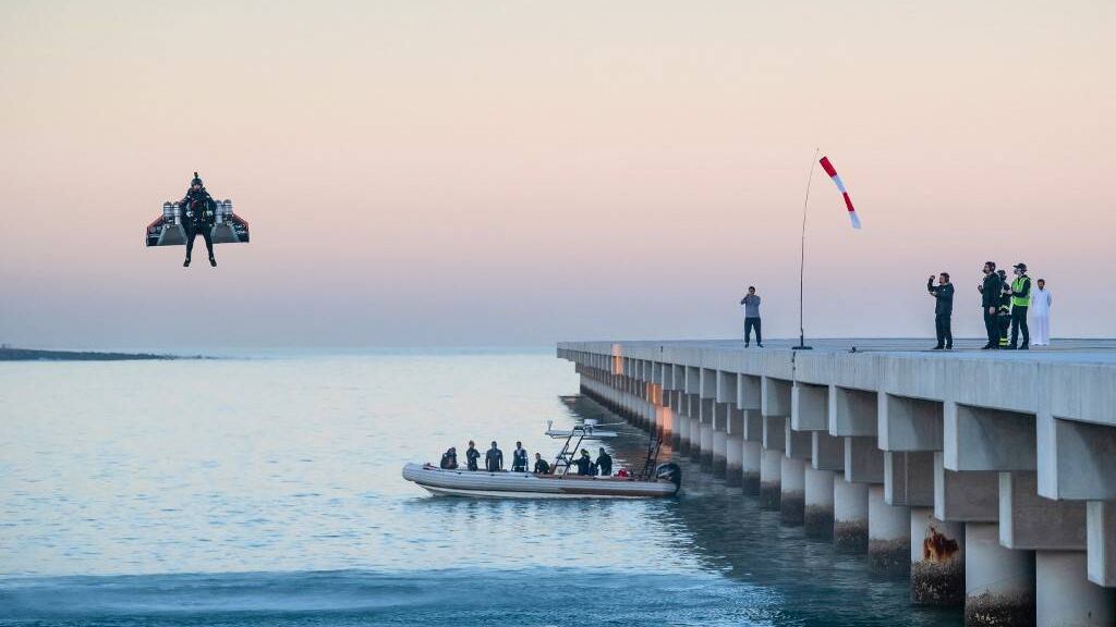 El vuelo fue realizado el viernes pasado por el deportista de 34 años, muy experimentado en desafíos extremos. En tanto él se elevaba, sus acólitos 'Jetmen' se lanzaban al aire saltando desde plataformas elevadas.