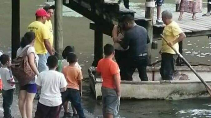 Decenas de personas que paseaban cerca del lago de Amatitlán se sorprendieron al ver a una pareja cuando se lanzan de una lancha hacia el agua.