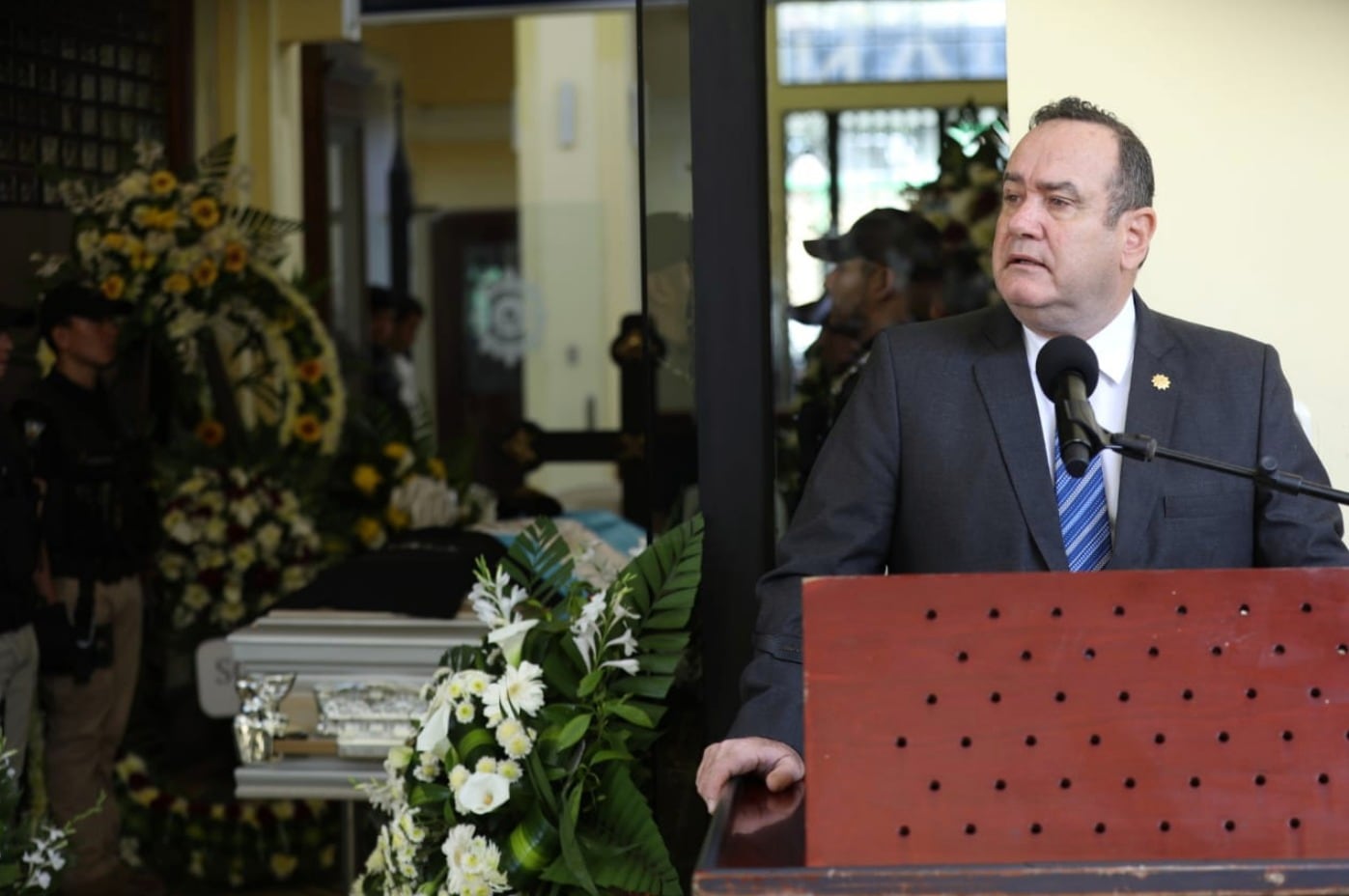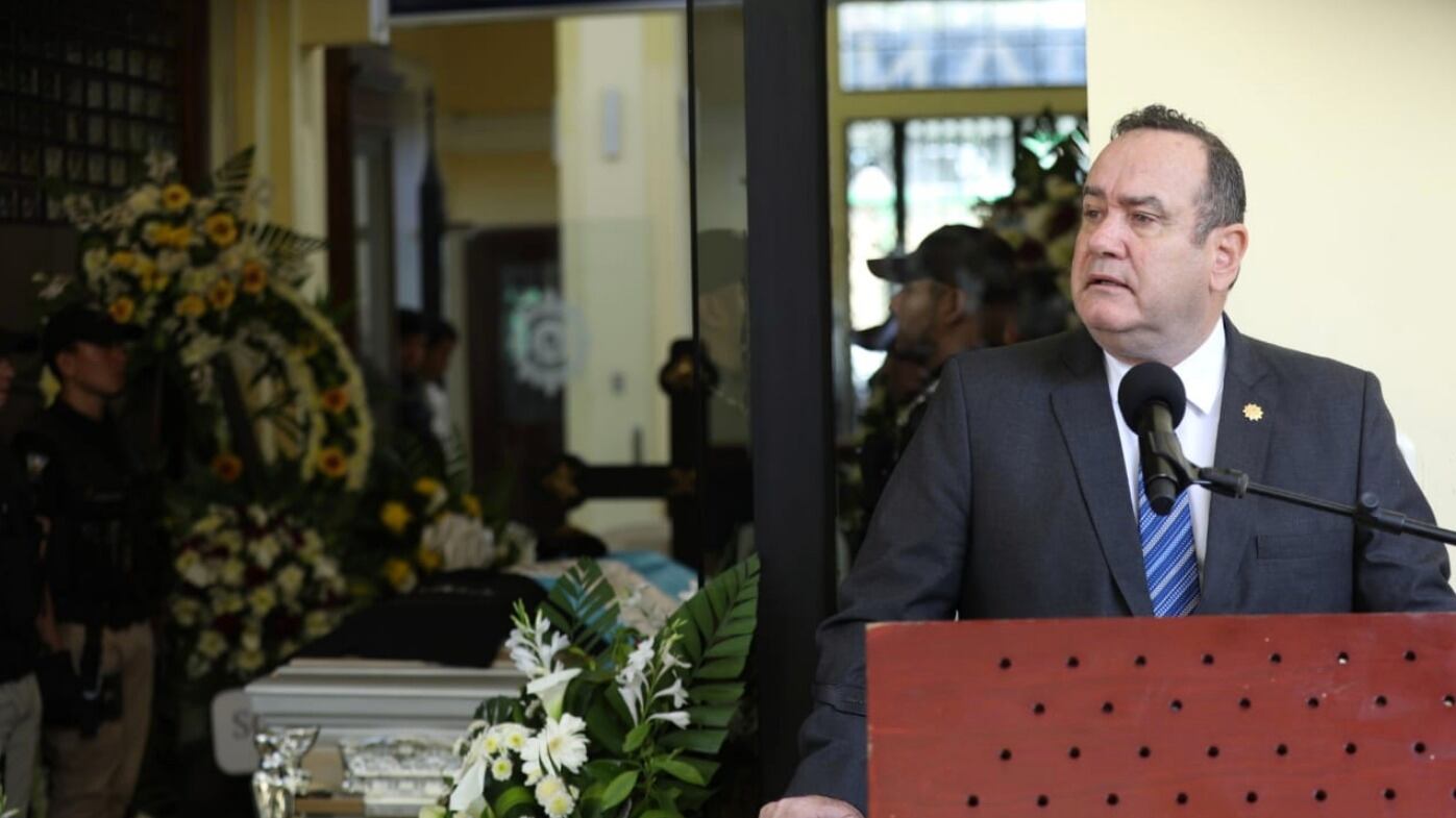 El presidente Alejandro Giammattei participó este jueves en las honras fúnebres que se realizan en sede la Policía Nacional Civil por la muerte del agente Nelson Vásquez.