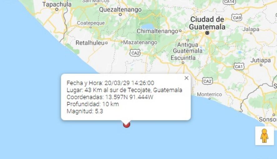 Previamente, la Coordinadora Nacional para la Reducción de Desastres (CONRED), ubicó la magnitud del sismo en 5.3, situando el epicentro 43 kilómetros al sur de la Playa de Tecojate, en el municipio de Nueva Concepción, Escuintla.