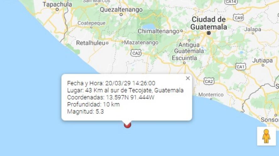 Previamente, la Coordinadora Nacional para la Reducción de Desastres (CONRED), ubicó la magnitud del sismo en 5.3, situando el epicentro 43 kilómetros al sur de la Playa de Tecojate, en el municipio de Nueva Concepción, Escuintla.