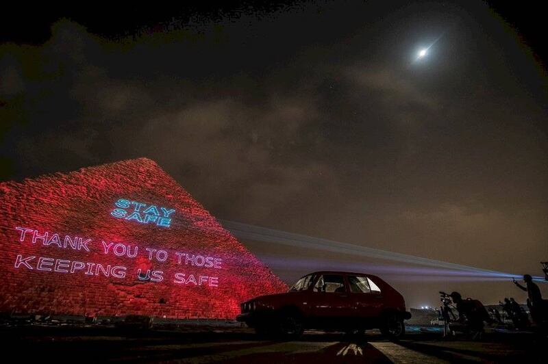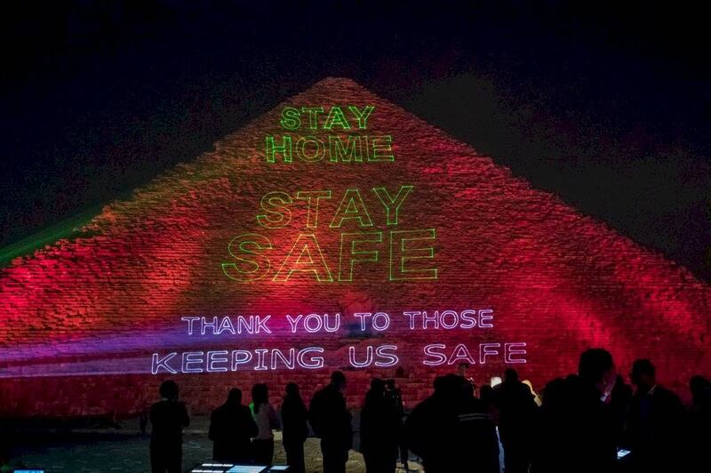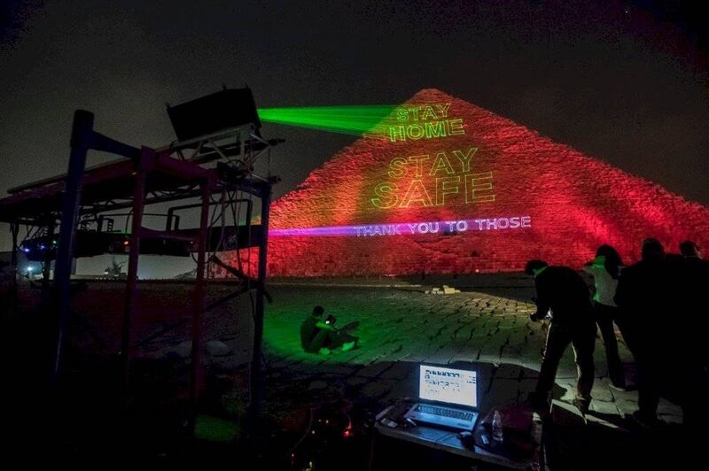 "Quédate en casa, mantente seguro", rezaba el mensaje proyectado este lunes sobre la gran pirámide de Guiza, en Egipto, en referencia a las precauciones que se deben tomar frente a la pandemia de coronavirus.