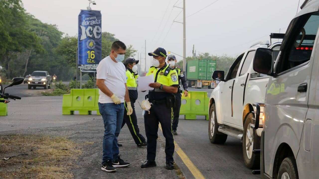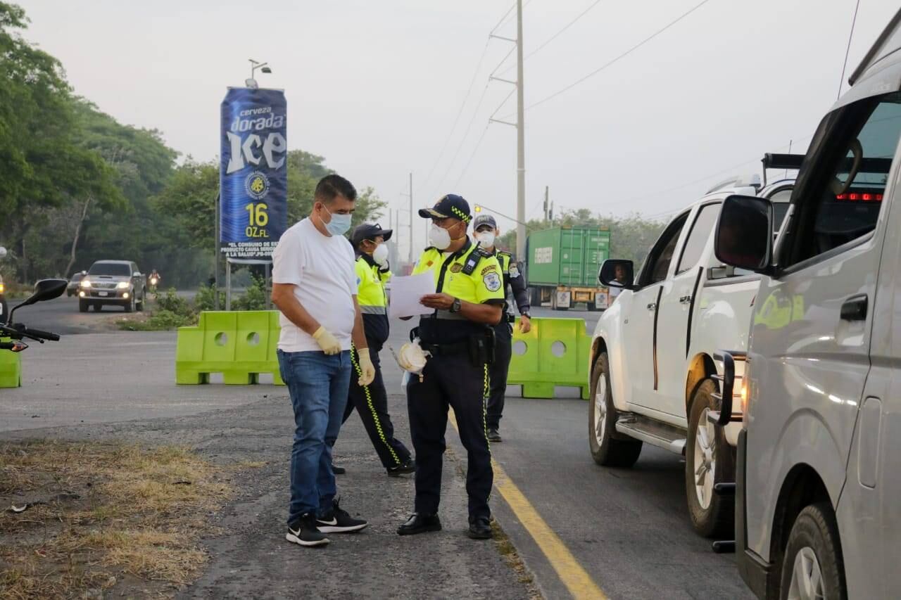 A los conductores se les solicita una identificación personal que los acredite como residentes o un carné de empleado para confirmar que se dirigen a sus labores. Además, hay un puesto de registro para toma de temperatura.