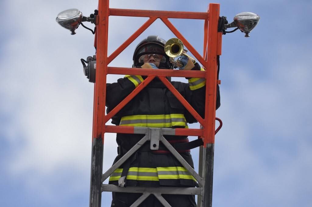 Recostado en el extremo superior de la escalera que sus colegas despliegan desde un carro autobomba, con su traje de bombero y trompeta en mano, García enciende el ambiente con un repertorio de música ecuatoriana.