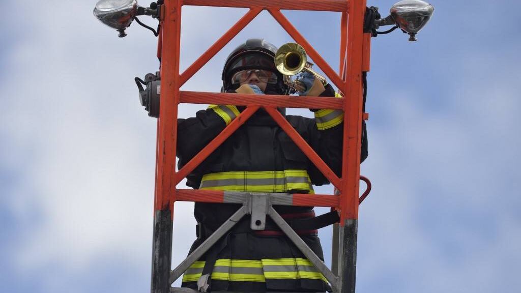 Un solo de trompeta rompe el silencio frente a un hospital de Quito. Desafiando el vértigo, sobre una escalera de 25 metros, el bombero Henry García toca melodías para animar al personal sanitario y a pacientes de coronavirus en la capital de Ecuador.