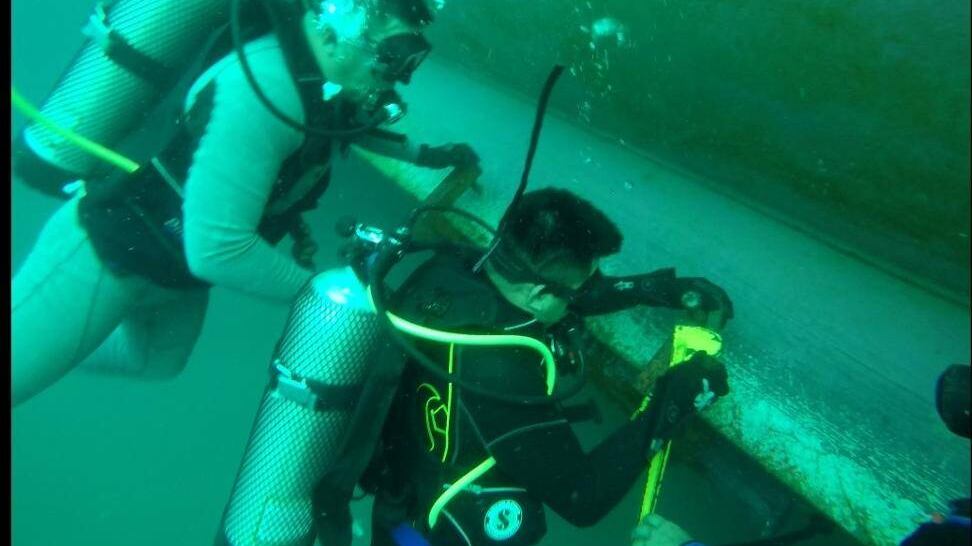 La inspección submarina del barco mercante UBC SAIKI permitió descubrir este parásito cilíndrico adherido a una aleta de la embarcación. El aparato fue separado y trasladado a tierra firme.