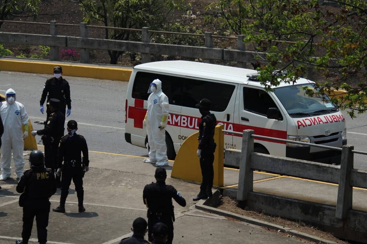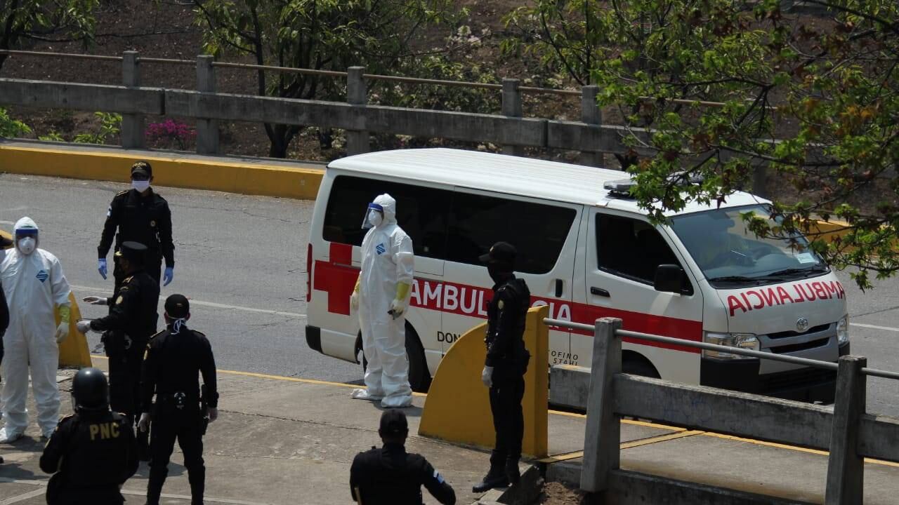 En el lugar se observan unidades de la Policía Nacional Civil (PNC), una ambulancia y personeros del Ministerio de Salud que utilizan trajes especiales de protección, parte del equipo implementado durante la emergencia del coronavirus.