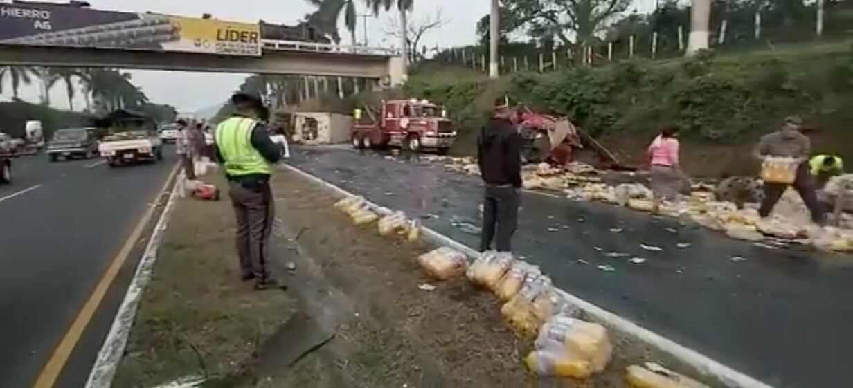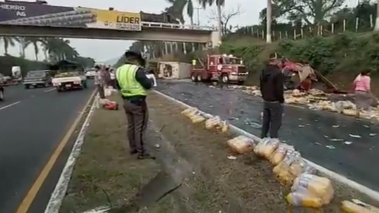 En el otro se trasladaba gran cantidad de mercadería, incluyendo botellas con jugo de naranja, la cual quedó esparcida en la carretera.