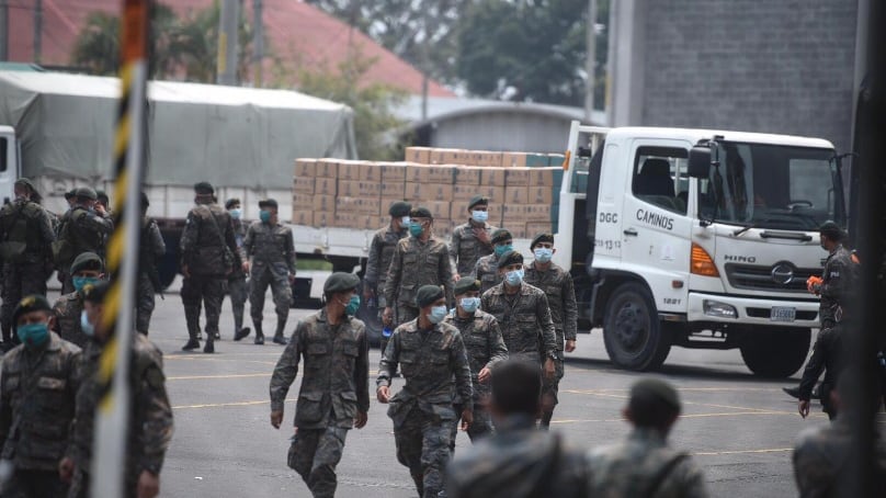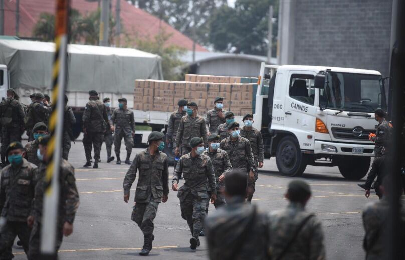 Los miembros del Ejército prestan servicio en el domo de la zona 13, este es el lugar en donde se embalan las cajas de alimentos que se entregan a la población guatemalteca por la crisis del COVID-19.