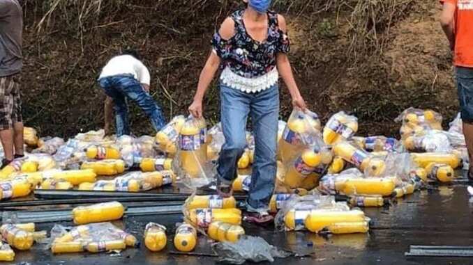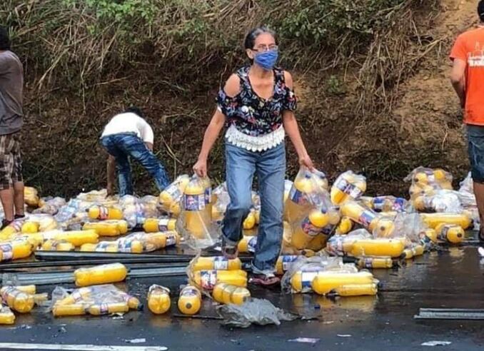 Uno de los tráiler transportaba jugos a base de naranja, producto que se han llevado los pobladores.
