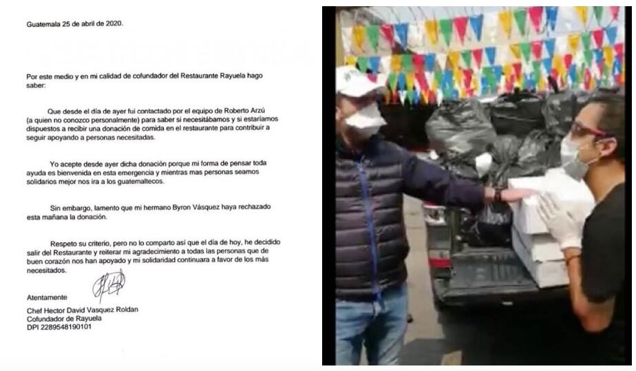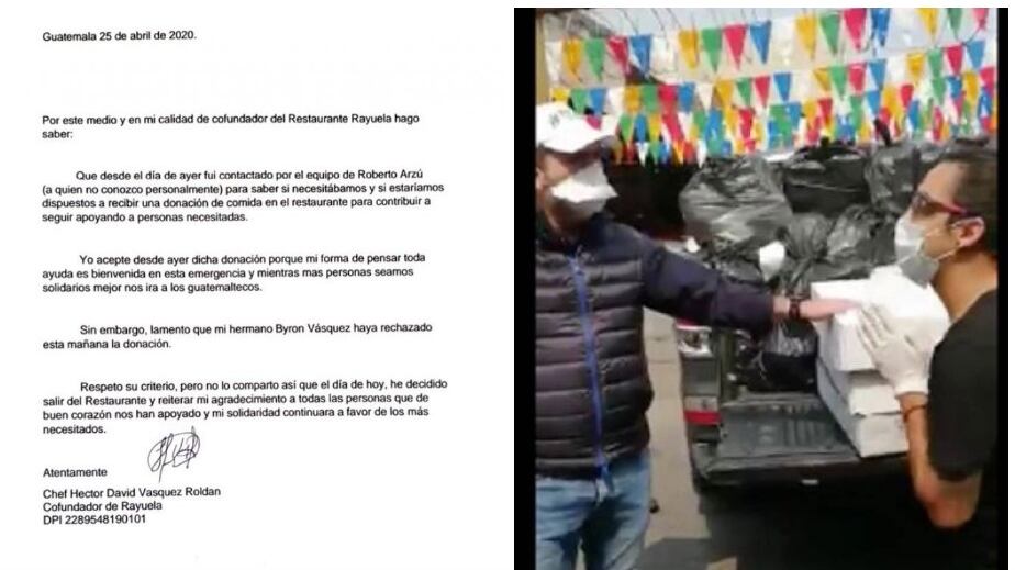 Este sábado, el excandidato presidencial Roberto Arzú llegó al Restaurante Rayuela para hacer entrega de una donación de 200 libras de pollo. Sin embargo, la ayuda fue rechazada por uno de los encargados del lugar.