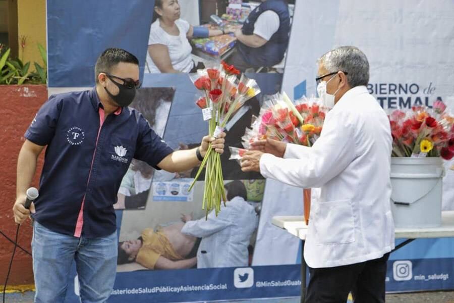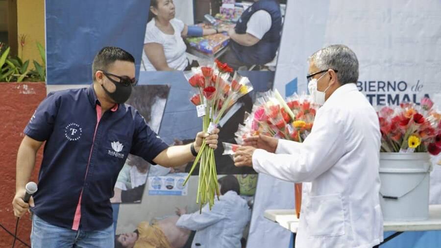 Los trabajadores de Salud que se encuentran atendiendo en primera línea a pacientes en los hospitales de Villa Nueva, Parque de la Industria y Quetzaltenango recibieron estas flores como estímulo y agradecimiento a su invaluable labor.