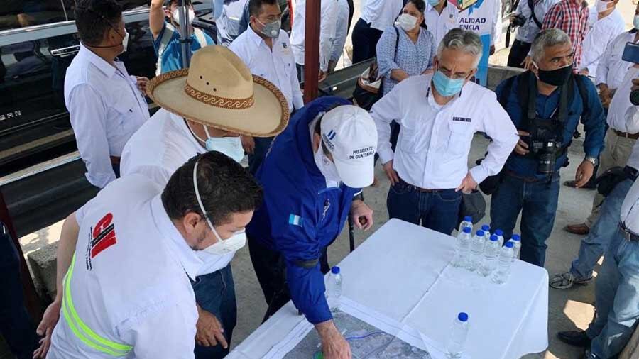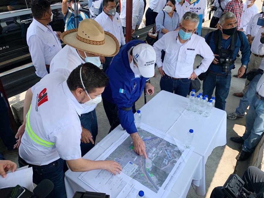 El alcalde de Palencia, Guadalupe Alberto "Beto" Reyes; así como el ministro de Comunicaciones, Infraestructura y Vivienda (CIV), Josué Lemus; el director de Caminos, Fredy Chojolán; y el mandatario Giammattei, revisaron los planos de esta nueva obra en Palencia.