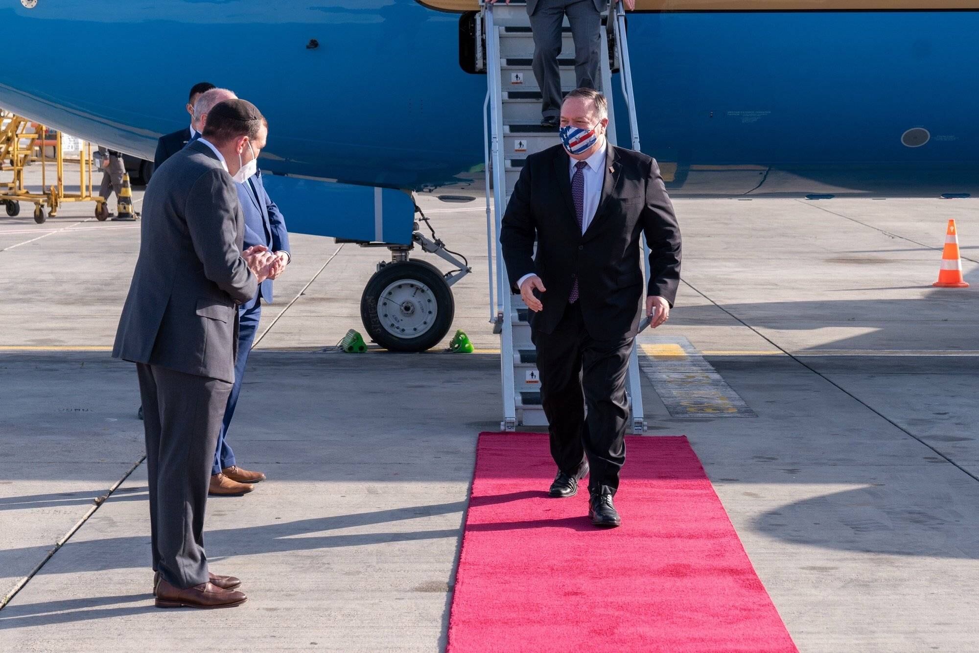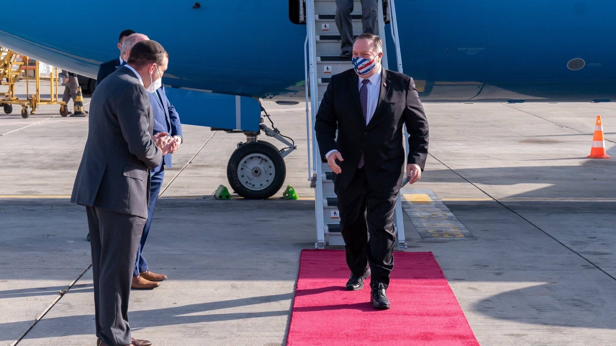 A su llegada al aeropuerto de Tel Aviv, Pompeo se colocó una mascarilla con los colores de la bandera estadounidense.