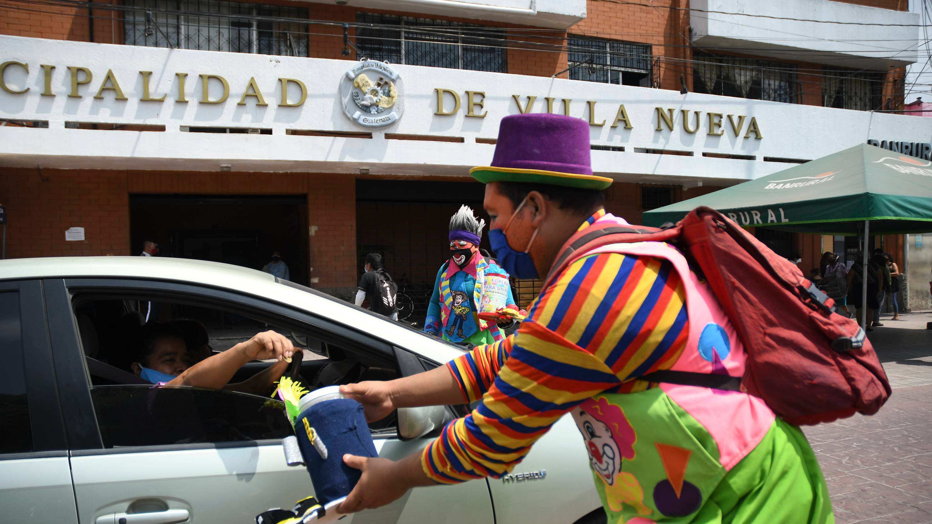 Con el rostro pintado, traje con colores vistosos y zapatos grandes, payasos guatemaltecos salieron a las calles a pedir alimentos y dinero ante la precaria situación que enfrentan por las restricciones impuestas para contener el nuevo coronavirus.