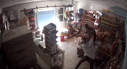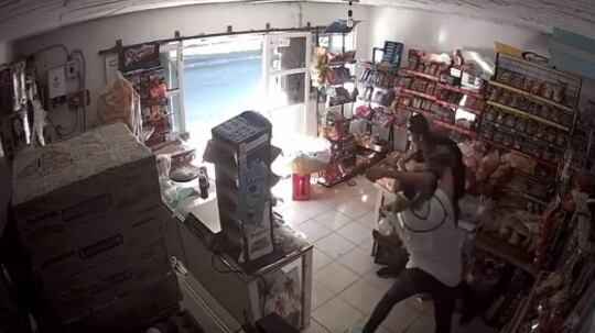 El joven suelta algunos golpes, pero la mujer no cede y lo somete para obligarlo a salir del comercio.