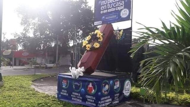 El mensaje está acompañado con un ataúd vacío, que representa los riesgos del virus SARS-CoV-2.