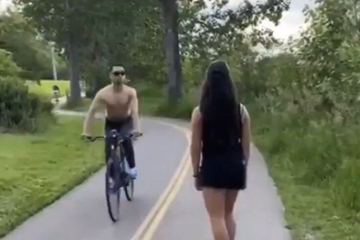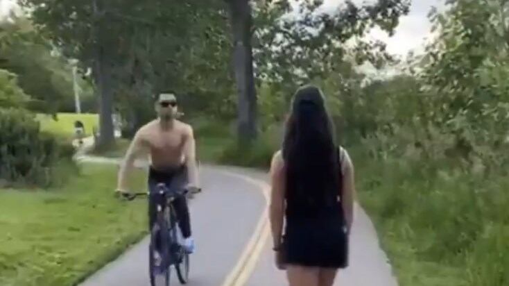 En las imágenes, se observa el momento en el que Lau y su pareja patinan en una de las áreas del parque, y solo segundos después Riaz Williams aparece montado en una bicileta, con el torso desnudo y llevando lentes de sol, y le lanza el escupitajo a la mujer sin razón alguna.