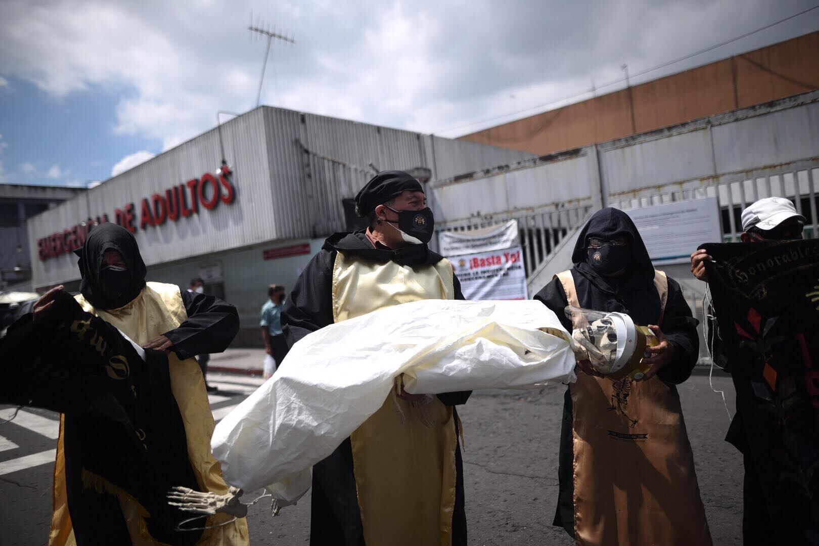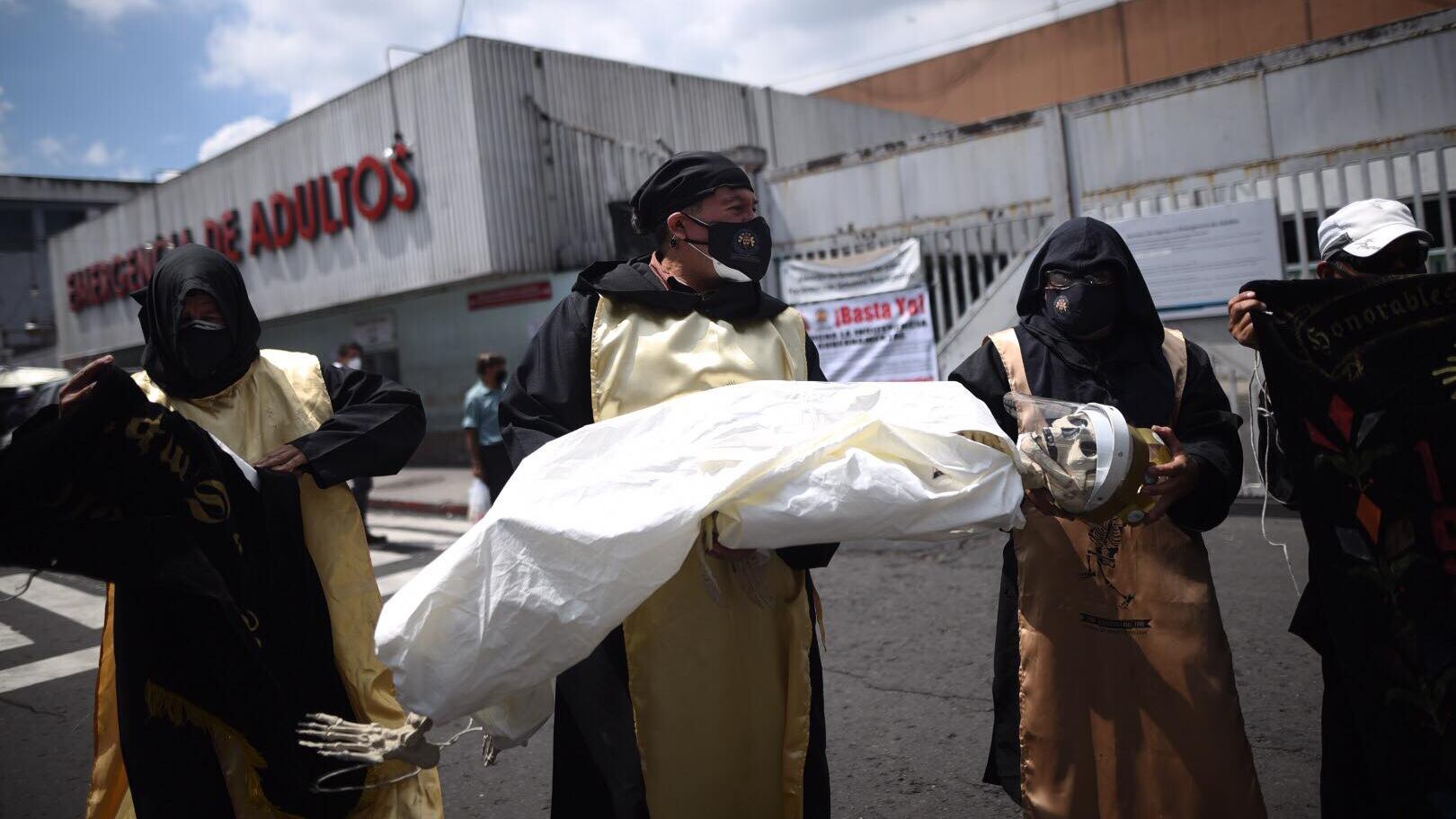 Representantes de la agrupación Honorables por Siempre, de la Universidad de San Carlos de Guatemala (USAC), acudieron al frontispicio del Hospital San Juan de Dios para solidarizarse con el equipo médico de primera línea que está afrontando la crisis del Covid-19.