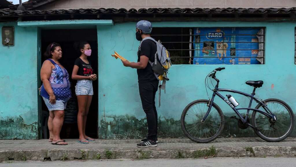 Suemily Alves, de 11 años, recibe las tareas gracias a Arthur, que cumple su misión en breves encuentros debido al coronavirus.