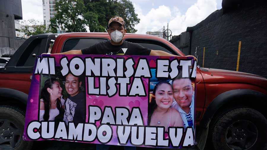 El joven llevó una manta vinílica con la frase “Mi sonrisa está lista para cuando vuelvas”, con la cual envió un mensaje esperanzador y de amor a su prometida.