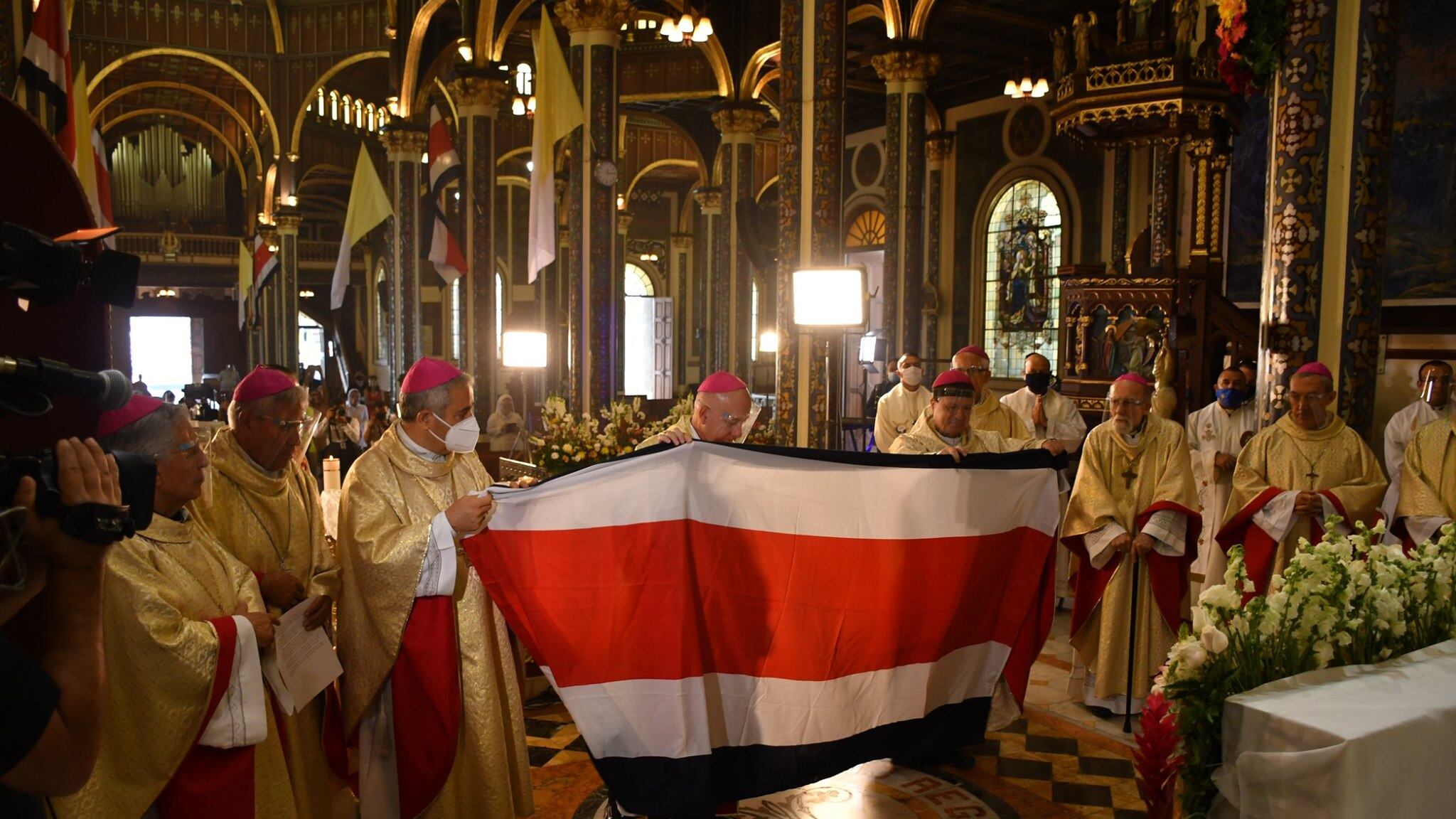 La eucaristía solemne de este domingo fue transmitida en la página de Facebook de la Basílica Nuestra Señora de Los Ángeles en Cartago. Desde el inicio de la celebración se observó que todos los participantes, sacerdotes y obispos utilizaron mascarillas o caretas como protección facial por el Covid-19.