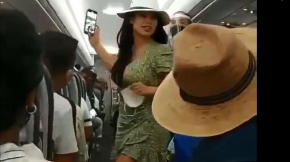 Ella, con un corto vestido verde, sombrero y celular siempre en la mano haciendo “Live”, se quita la mascarilla para discutir con otros viajeros y asegura repetidamente, y con palabras vulgares, que el Covid-19 no le importa a nadie de los que están en el avión.