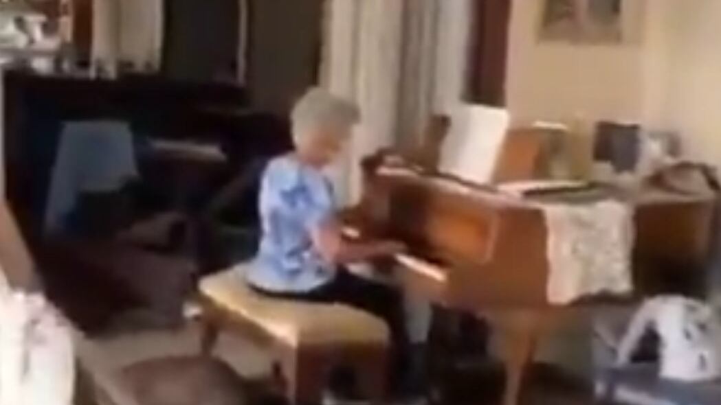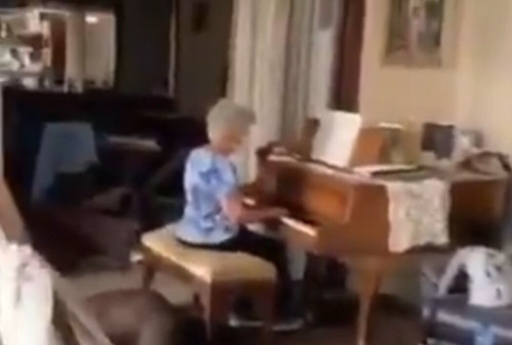 La sobrecogedora estampa, en la que se observan las ventanas de la vivienda rotas, las cortinas desgarradas y los muebles dañados, contrasta con la dulce melodía interpretada perfectamente por la anciana.