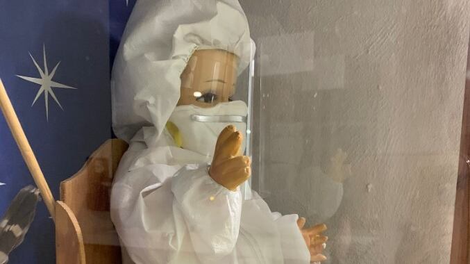 En la foto también se observa que el niño Dios lleva puesta una mascarilla y una careta.
