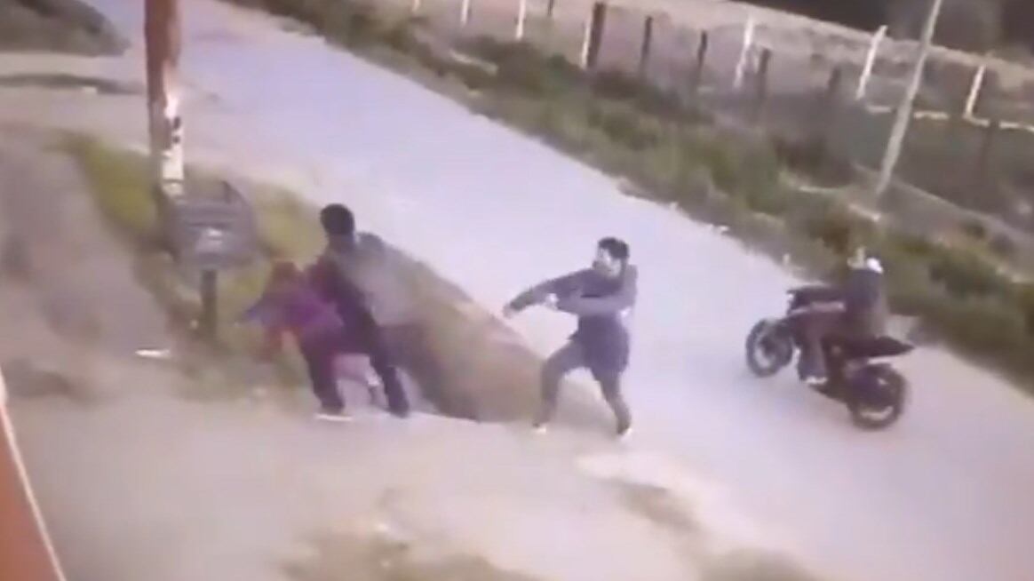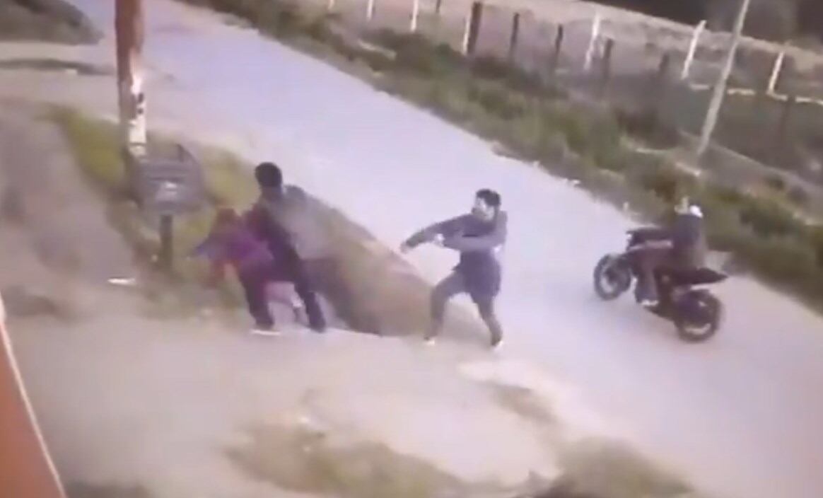 Una cámara de vigilancia captó el momento en el que dos motoladrones asaltaron y golpearon a un hombre que caminaba junto a su pequeña hija en el barrio Villa Montoro, en la región argentina de La Plata.