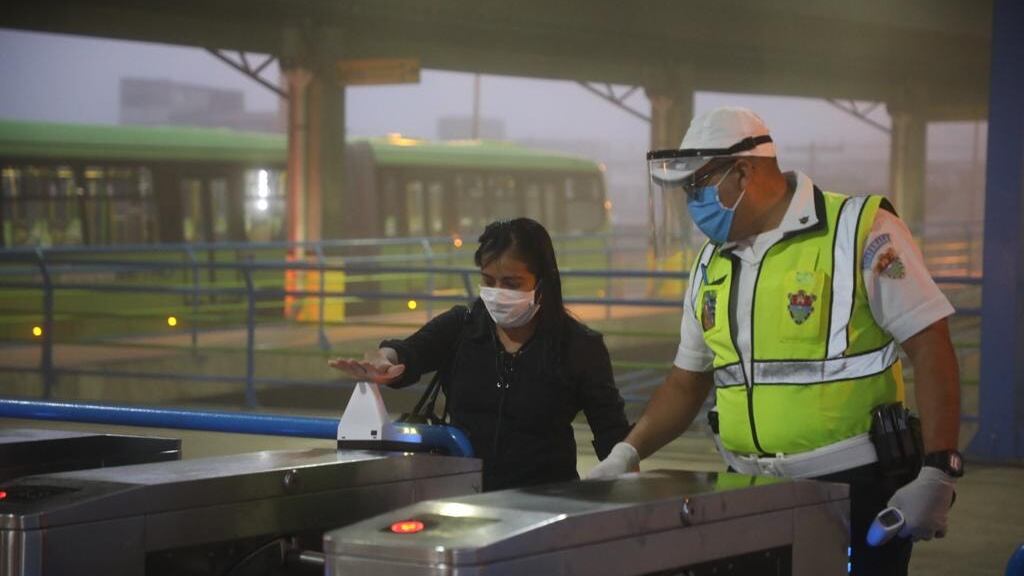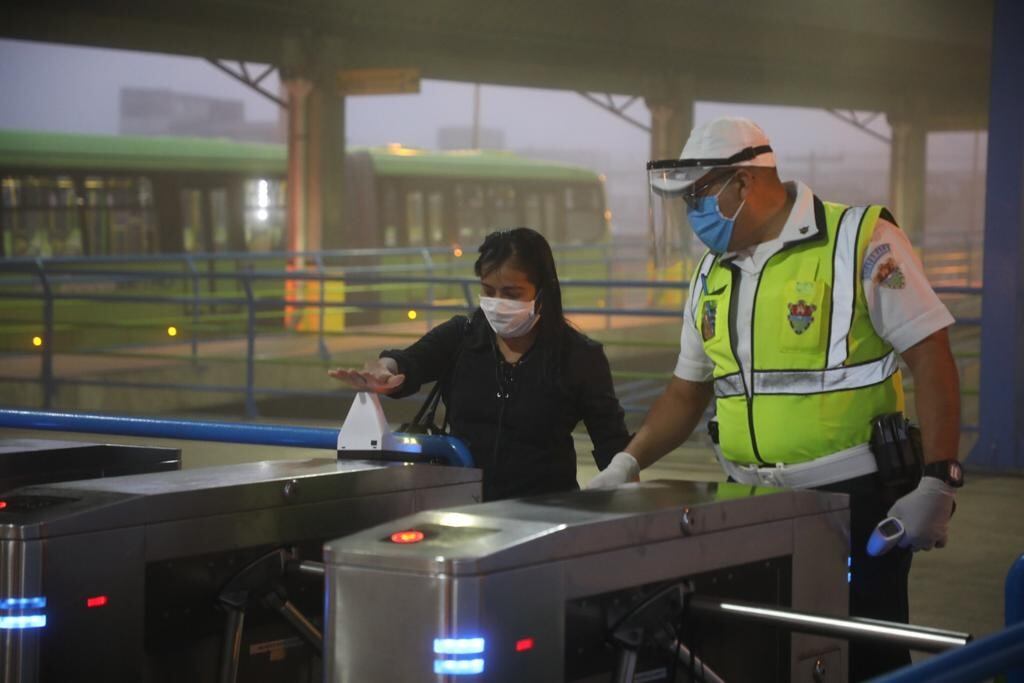 Antes de abordar la unidad de Transmetro deberán tomarse la temperatura corporal y aplicarse alcohol en gel.