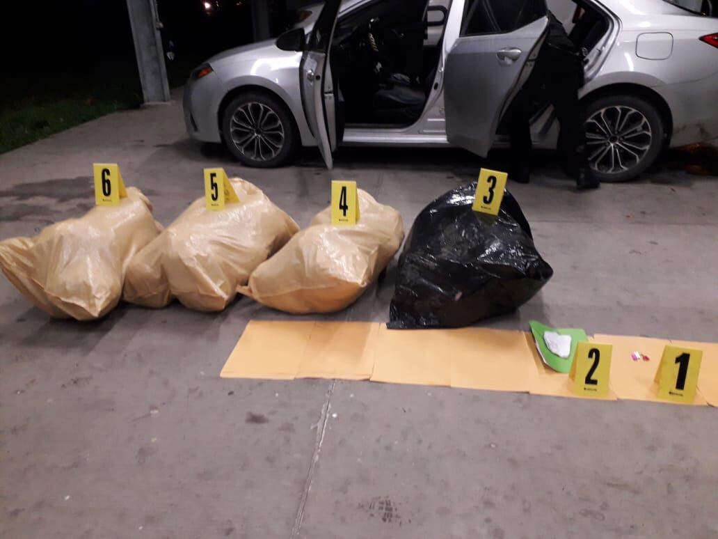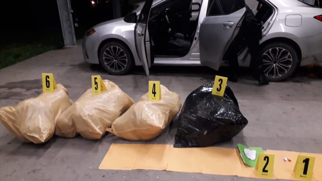 El automóvil tipo sedan, de color gris, fue inspeccionado y se logró ubicar en el baúl varios costales con paquetes que contenían una sustancia.