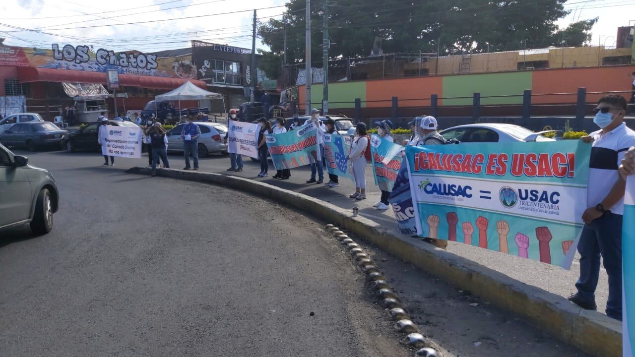 El personal docente, administrativo y de servicios de la Escuela de Ciencias Lingüisticas y del Centro de Aprendizaje de Lenguas (Calusac) de la Universidad de San Carlos (USAC), realizó el cuarto plantón para exigir el pago de sus salarios, así como otras peticiones.