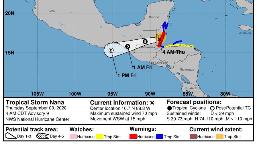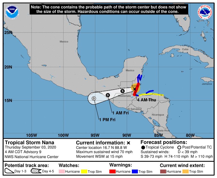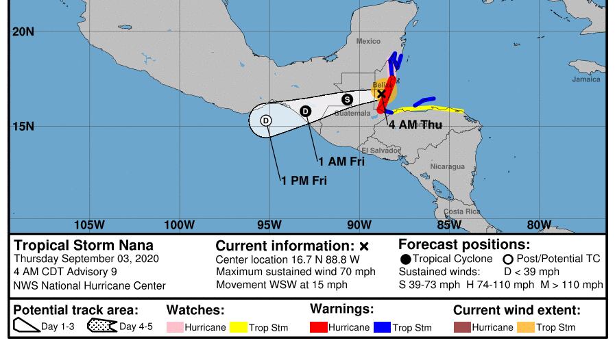 La madrugada de este jueves el huracán “Nana” se debilitó al ingresar en Belice y actualmente es tormenta tropical, la cual está en el departamento de Petén.