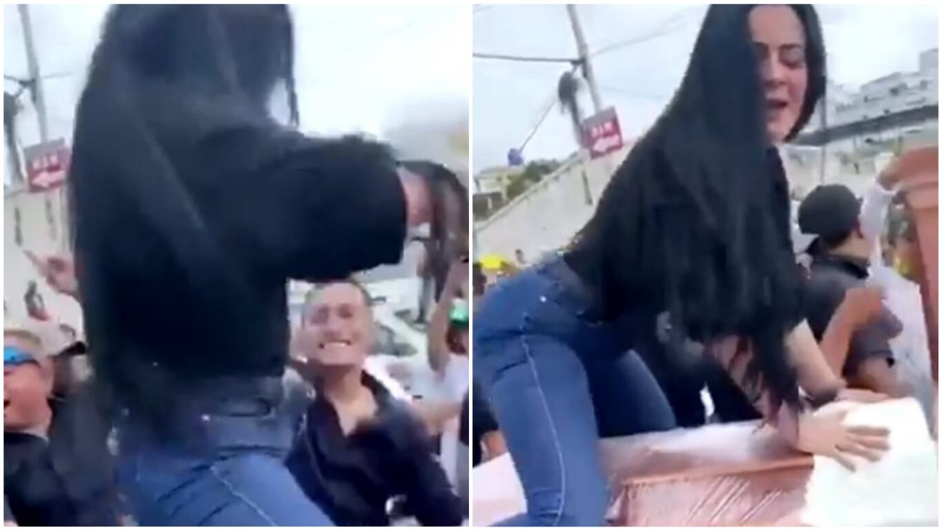 En la grabación, de poco menos de un minuto, se observa a la mujer, vestida con una blusa de color negro y pantalones vaqueros, sentada sobre la caja y bailando de forma provocativa.