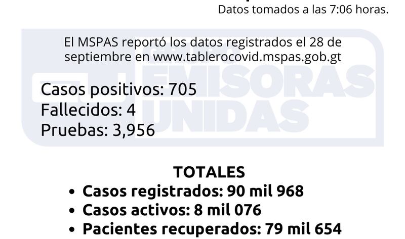 El Ministerio de Salud Pública y Asistencia Social (MSPAS) actualizó la cifra de contagios por coronavirus para este 29 de septiembre.