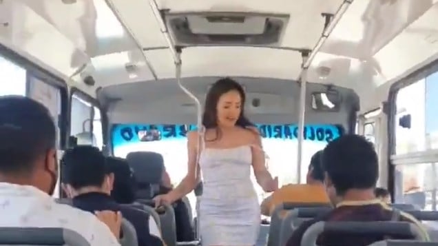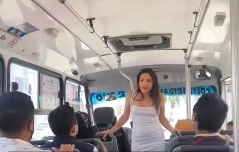 “¡Que pase para acá atrás (del autobús)!”, le grita uno de los viajeros, sacándole una sonrisa a la actriz, quien sin dudarlo avanza para repetir el espectáculo en la parte trasera de la unidad.